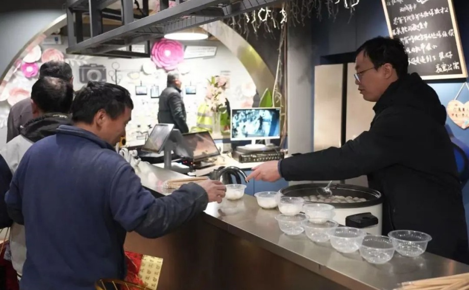 除了法律知識的普及、政策服務的宣傳,活動現場還充滿了濃濃的節日氛圍。商務區黨工委為參與活動的集宿區員工與建筑工人送上熱氣騰騰的湯圓,并將法治元素、黨建元素融入元宵祝福中。湯圓雖小,卻承載著滿滿的溫暖與關懷,讓這個元宵節變得格外暖心。此外,商務區兩新工委準備了傳統冰糖葫蘆,“一串紅果送甜蜜,情暖工友慶元宵”,讓工人朋友在節日里感受到甜蜜與溫暖。