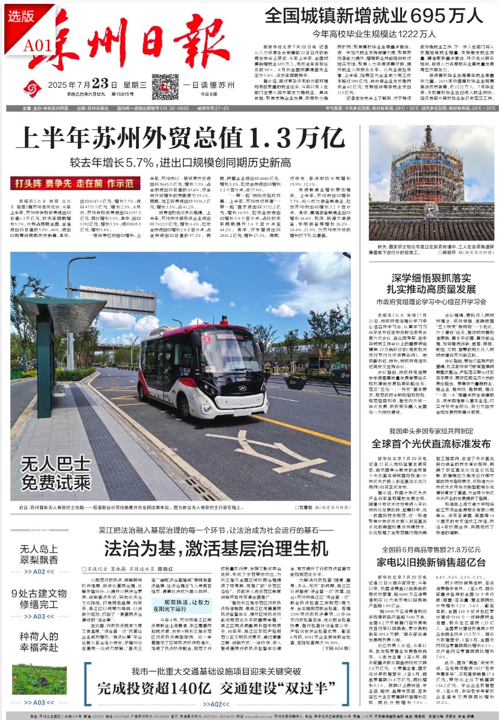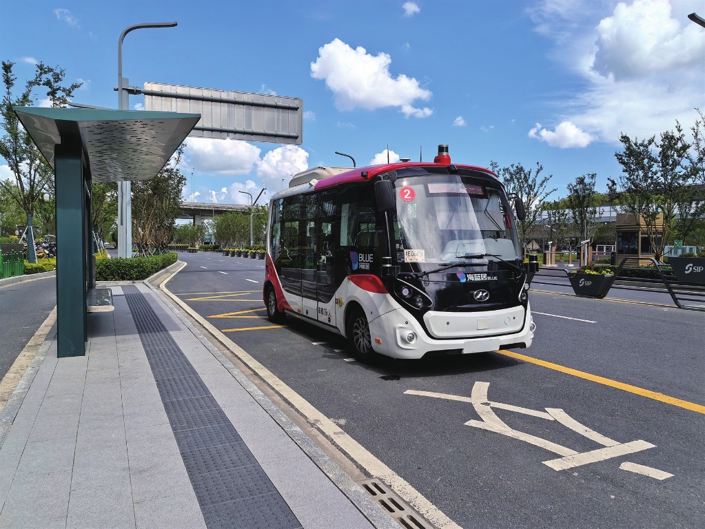 近日,蘇州首條無人駕駛巴士線路——陽澄數谷示范線免費開放全民試乘體驗。圖為昨日無人駕駛巴士行駛在路上。(視覺蘇州供圖)