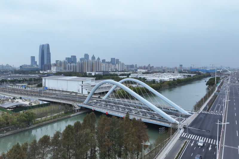陸涇路南延由園區市政建設管理中心建設,北起至和西路、南至蘇虹西路,全長856米,雙向6車道,于2023年7月開工建設。項目包括新建1座跨婁江橋梁,總長147米,主橋為單跨87米的鋼結構外傾式系桿拱橋,拱肋采用直線與拋物線組合的異形拱軸線,造型靈動通透。