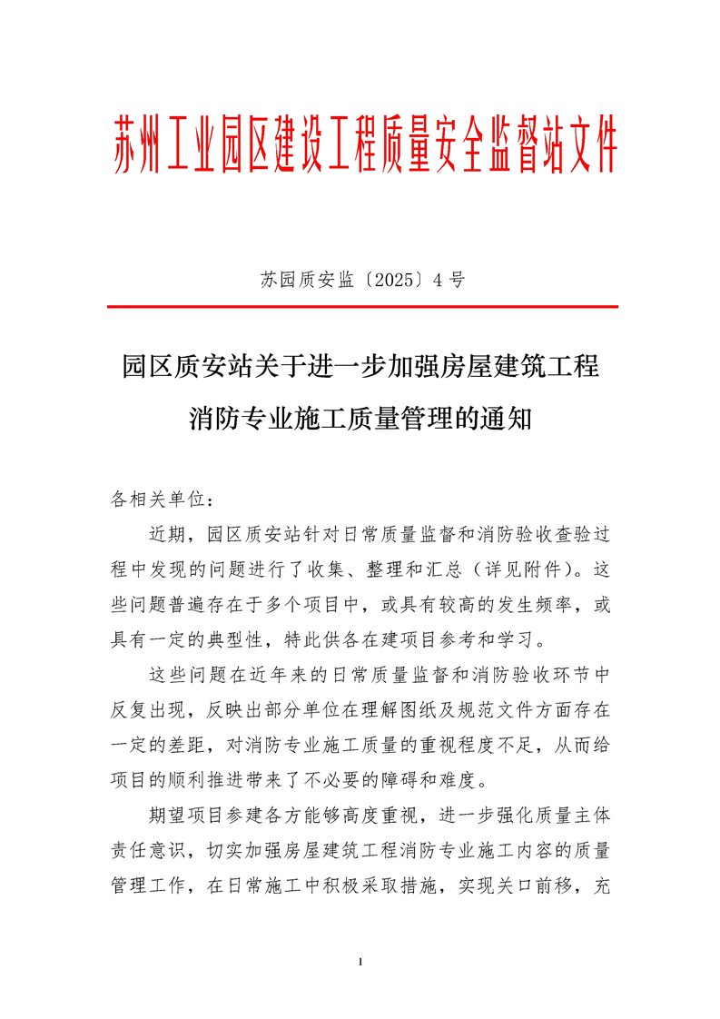 園區質安站關于進一步加強房屋建筑工程消防專業施工質量管理的通知