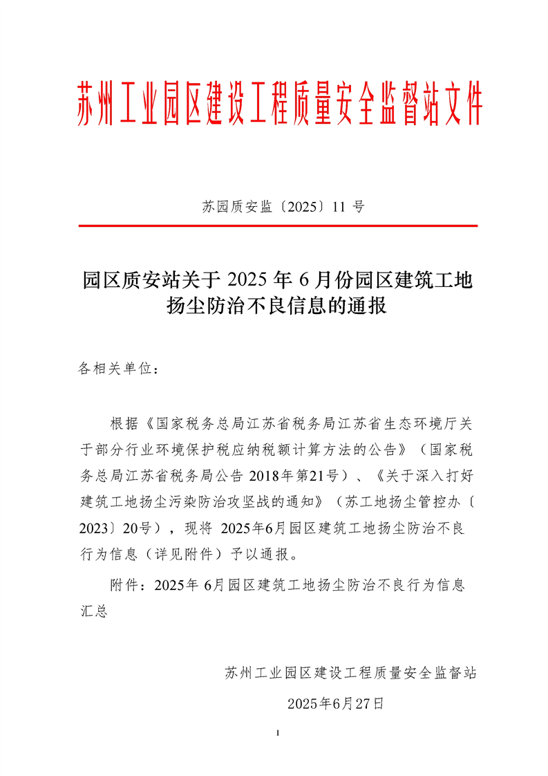 園區(qū)質(zhì)安站關(guān)于2025年6月份園區(qū)建筑工地?fù)P塵防治不良信息的通報(bào)