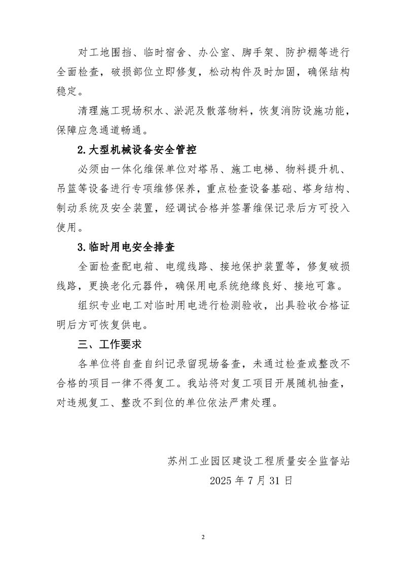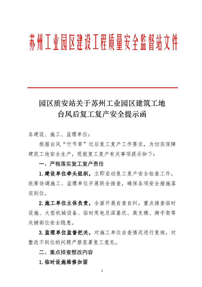 園區質安站關于蘇州工業園區建筑工地臺風后復工復產安全提示函