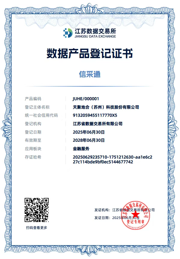 作為江蘇省級(jí)公共數(shù)據(jù)授權(quán)運(yùn)營(yíng)首批核心開發(fā)主體,天聚地合提供的權(quán)威個(gè)人及企業(yè)信用維度數(shù)據(jù)服務(wù),彰顯了公司在推動(dòng)公共數(shù)據(jù)要素市場(chǎng)化流通中的技術(shù)實(shí)力與責(zé)任擔(dān)當(dāng)。該產(chǎn)品致力于優(yōu)化金融機(jī)構(gòu)個(gè)人信用評(píng)估模型,提升風(fēng)險(xiǎn)識(shí)別精準(zhǔn)度與效率;賦能企業(yè)資質(zhì)智能核驗(yàn)與多維度風(fēng)險(xiǎn)動(dòng)態(tài)評(píng)估,助力金融機(jī)構(gòu)及商業(yè)伙伴高效識(shí)別優(yōu)質(zhì)企業(yè),動(dòng)態(tài)監(jiān)控經(jīng)營(yíng)風(fēng)險(xiǎn)。