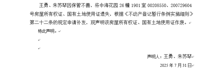 關于中海花園26幢1901室00208550、200729604號房屋所有權證、國有土地使用證遺失聲明