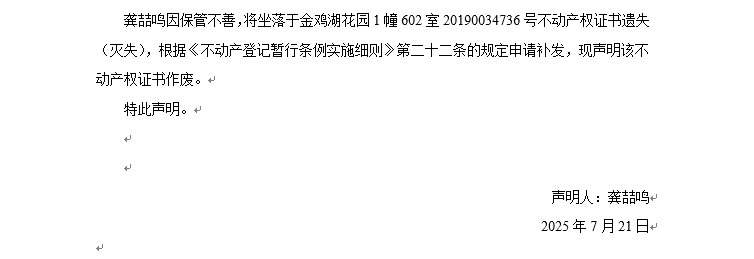 關于金雞湖花園1幢602室20190034736號不動產權證書遺失聲明