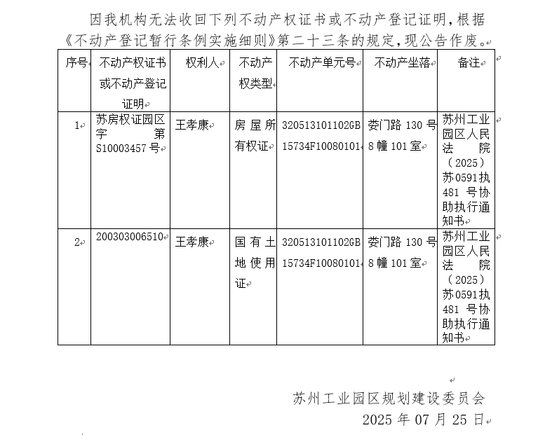 不動產(chǎn)權(quán)證書/登記證明作廢公告蘇園 證廢字2025(0100)號(婁門路130號8幢101室)