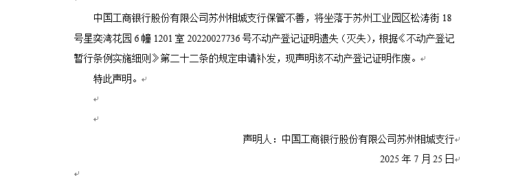 關于蘇州工業園區松濤街18號星奕灣花園6幢1201室20220027736號不動產登記證明遺失聲明