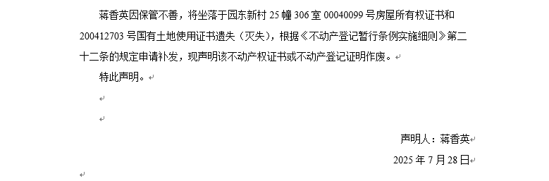 關于園東新村25幢306室00040099號房屋所有權證書和200412703號國有土地使用證書遺失聲明