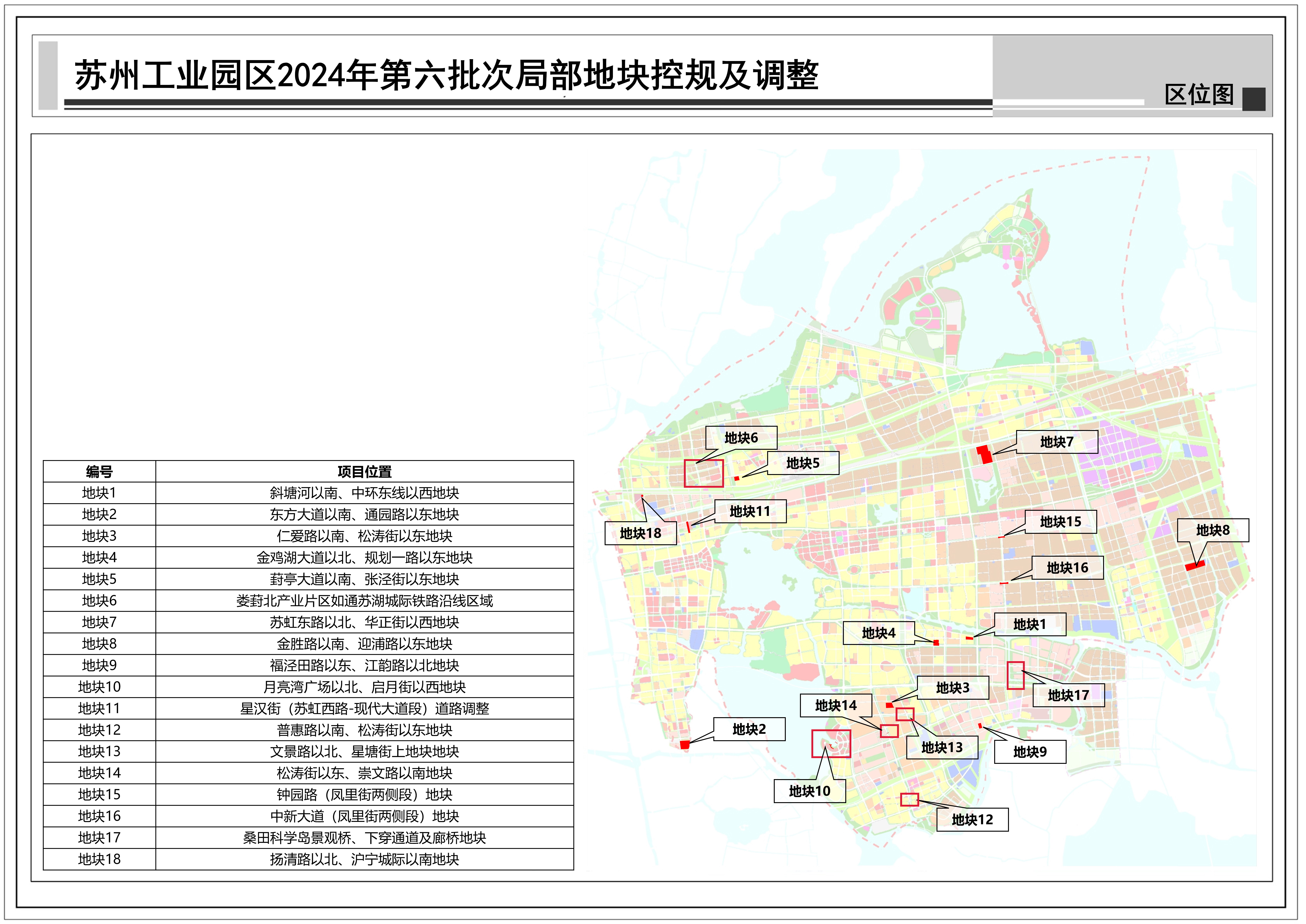 蘇州工業(yè)園區(qū)2024年第六批次局部地塊控規(guī)及調(diào)整:共包括18個地塊,總用地面積約0.80平方公里,詳見附圖區(qū)位圖。