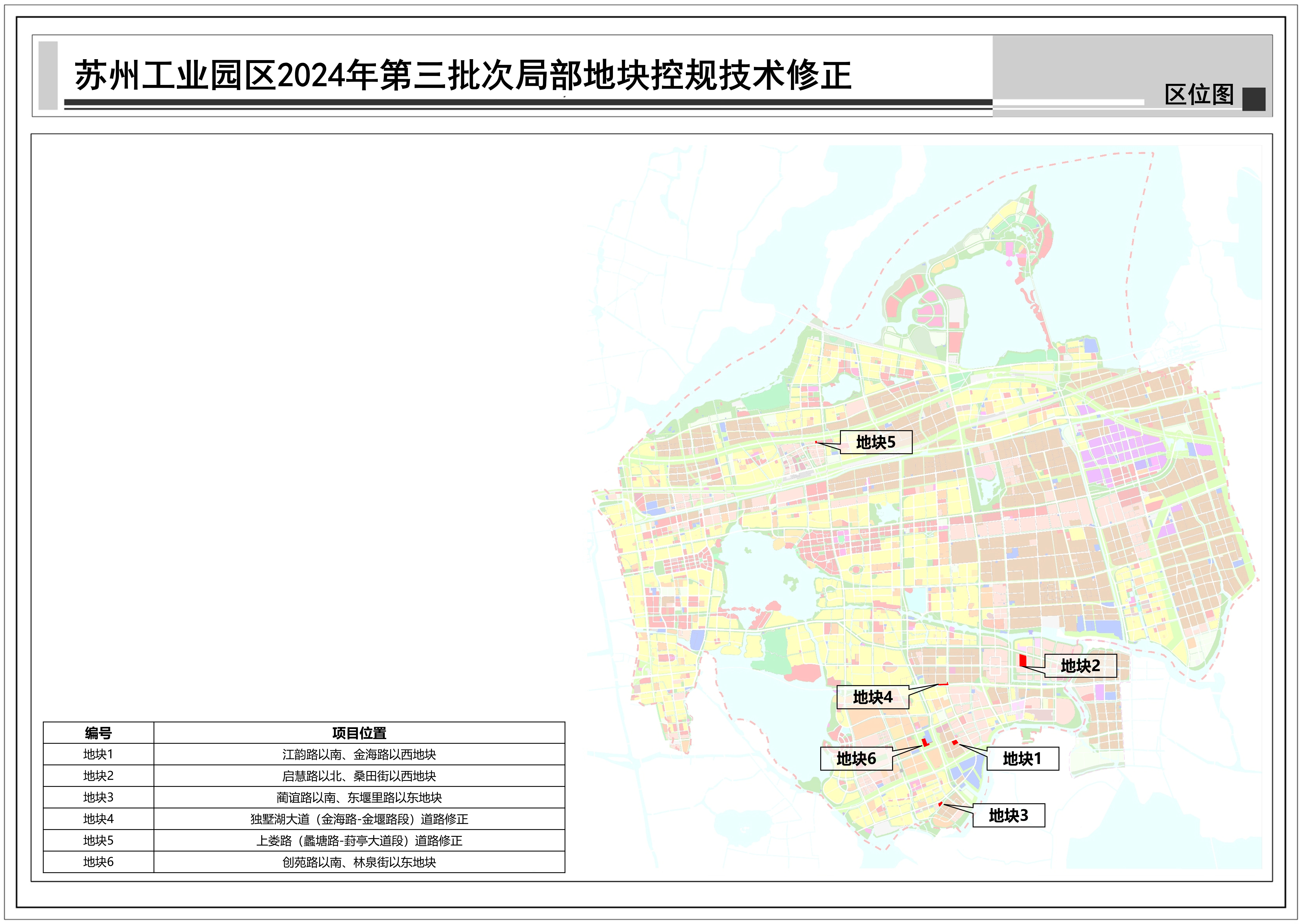 蘇州工業(yè)園區(qū)2024年第三批次局部地塊控規(guī)技術修正:共包括6個地塊,總用地面積約0.25平方公里,詳見附圖區(qū)位圖。