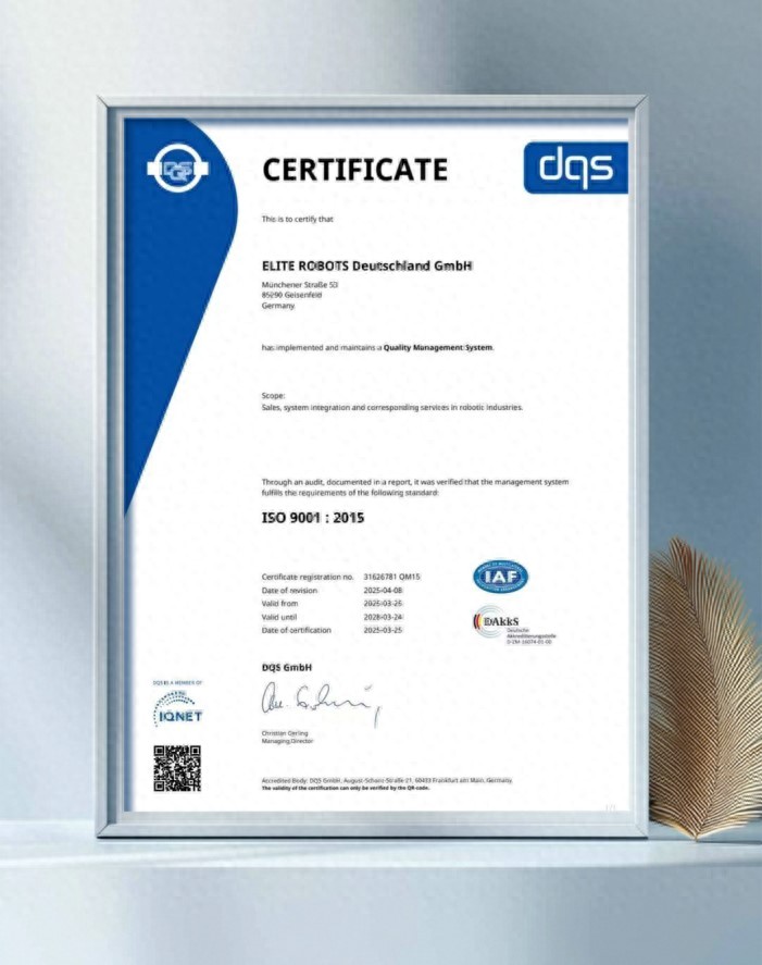 最近、蘇州工業(yè)園區(qū)の企業(yè)エリートロボットは、中國「ISO9001 三體系認証」取得に続き、ELITEROBOTSドイツ有限公司がドイツ國內のISO9001品質マネジメントシステム認証を正式に取得した。國産協(xié)働ロボット分野では初めてドイツ國內の認証を取得した中國企業(yè)となり、EUのハイエンド市場への參入に固い基盤を築いた。