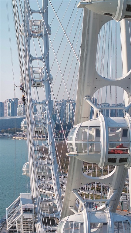 昨日,園區“蘇州之眼”摩天輪項目現場,工作人員正在抓緊進行亮化工程作業,為早日開業做準備。