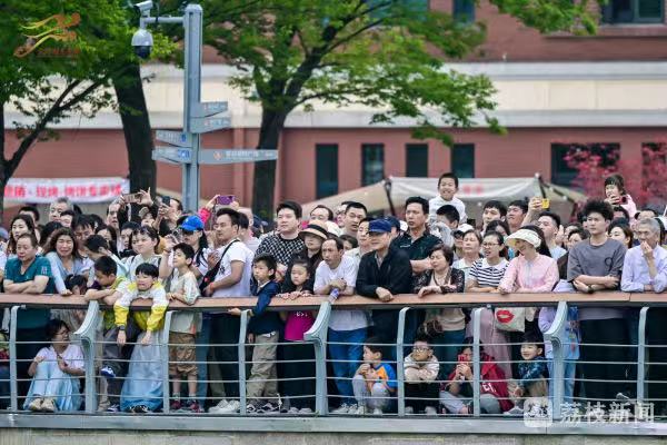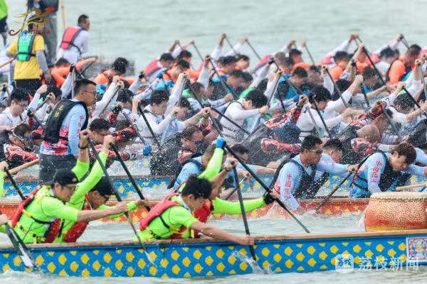 金雞湖上,一艘艘龍舟上演百龍爭(zhēng)渡,龍舟隊(duì)員們齊心協(xié)力、揮槳如飛,向著終點(diǎn)全力沖刺。現(xiàn)場(chǎng),既有專業(yè)隊(duì)伍的速度與激情,也有國(guó)際友人解鎖“龍舟新姿勢(shì)”,彰顯著“龍舟精神”的多元魅力。如今,金雞湖端午龍舟賽已經(jīng)成為蘇州的新民俗,吸引了眾多的市民和游客前來觀賽,為自己喜愛的隊(duì)伍加油助威。