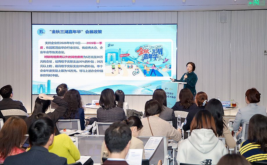 會上,園區商務局服貿處詳細介紹了園區辦會辦展專項政策,以及各類規模會議補貼內容。作為“金秋?三湖嘉年華”系列讓利舉措之一,園區首次出臺企業在酒店辦展辦會的補貼政策,以真金白銀惠企利民。自2025年9月13日起至2026年一季度,企業在園區酒店舉辦各類會議會展活動,除場租費用外的其他費用可享受20-25%補貼,最高10萬。
