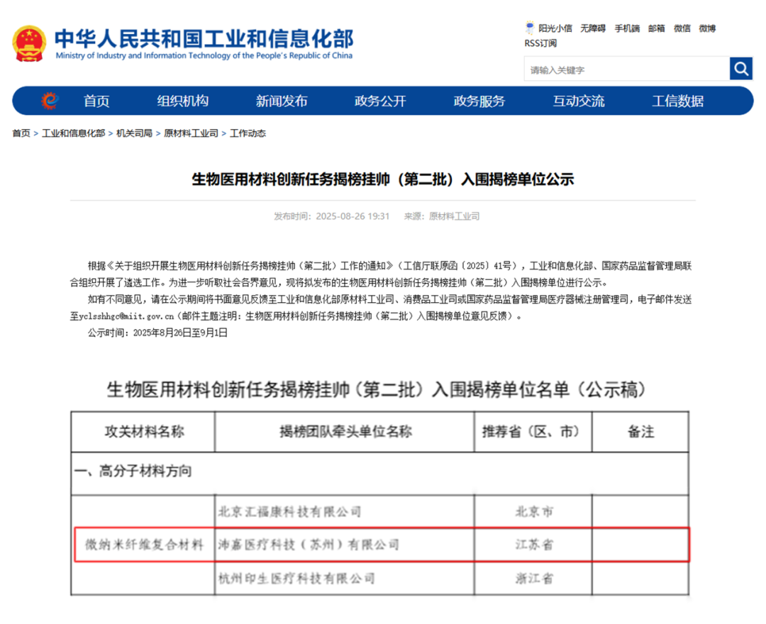 2025年8月,沛嘉醫(yī)療與聯(lián)合體成員單位等共同申報的“用于心臟瓣膜的超高分子量聚乙烯微納米纖維仿生復(fù)合材料研發(fā)及應(yīng)用”項目,成功入選由工業(yè)和信息化部、國家藥品監(jiān)督管理局聯(lián)合發(fā)布的生物醫(yī)用材料創(chuàng)新任務(wù)揭榜掛帥(第二批)入圍單位名單。