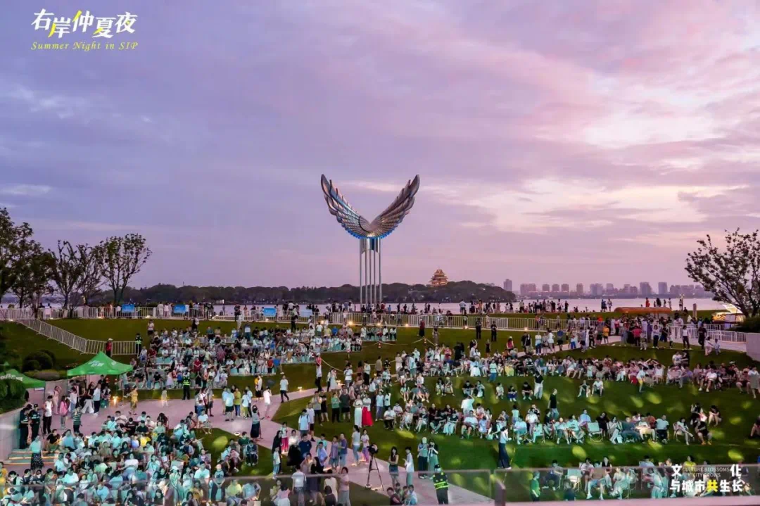 當夕陽的余暉為蘇州文化藝術中心的《入戲》雕塑鍍上一層溫暖的金色,“落日事集”便成了都市人最愛的精神棲息地。這個充滿年輕活力的藝文空間,每個晴天傍晚都會準時開市,即興音樂演出、改裝車攤位、創意手作和露天電影輪番上演,讓金雞湖畔瞬間變身城市最放松的休閑勝地。