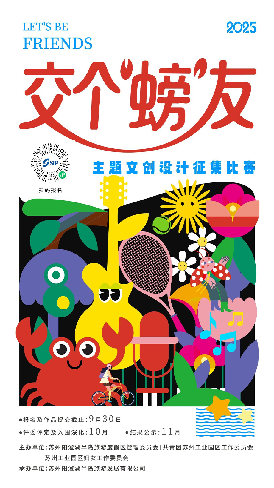 本次活動巧妙依托蘇州知名風物——“陽澄湖大螃蟹”這一廣受歡迎的“網紅IP”,借用“大螃蟹”(螃)與“朋友”(朋)的諧音,圍繞陽澄湖半島國家級旅游度假區“青年友好、兒童友好、運動友好、音樂友好、寵物友好”五大元素,開展貼近年輕群體的文創潮流設計。