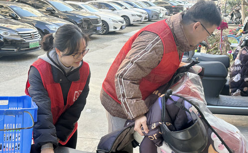與此同時,在新東苑社區(qū),結(jié)對下沉的高貿(mào)區(qū)黨員志愿者正忙著清理樓道口的電動自行車。“這輛車我?guī)兔ε驳酵\噮^(qū)。”“阿姨,電動自行車停在這兒會影響大家通行,我?guī)湍七^去吧。”一番耐心勸導(dǎo)和動手整理后,樓道出入口恢復(fù)了寬敞整潔。另一邊,清理小廣告的志愿者正小心地鏟除墻面上頑固的“牛皮癬”,再用抹布細(xì)細(xì)擦凈。