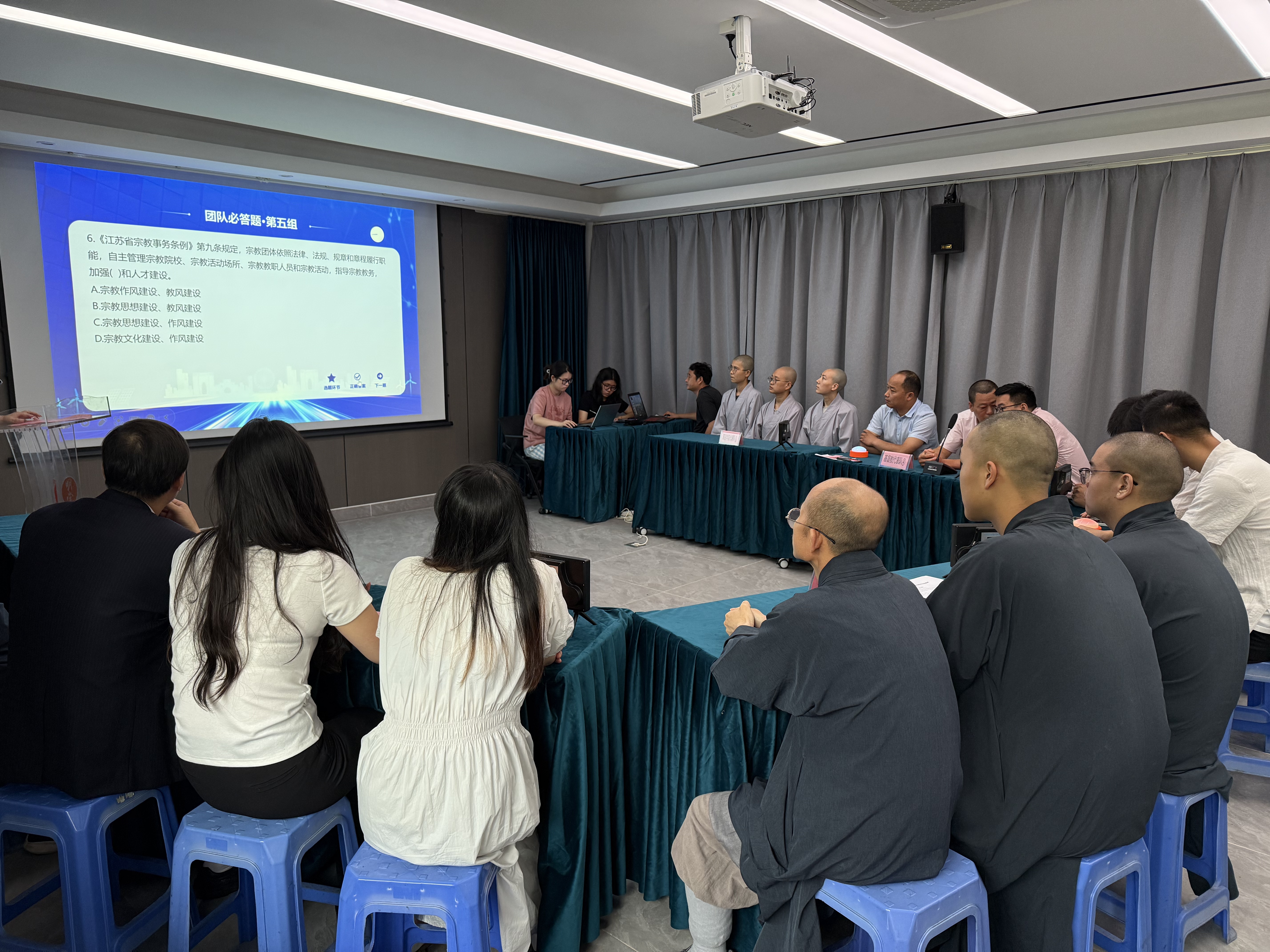 活動現(xiàn)場,舉辦了園區(qū)民宗政策法規(guī)知識競賽,園區(qū)佛教協(xié)會、道教協(xié)會、天主教愛國會、基督教三自愛國會、江蘇佛學(xué)院寒山學(xué)院和江蘇佛學(xué)院清涼學(xué)院各自組建代表隊(duì)參賽,現(xiàn)場六支代表隊(duì)參賽選手在答題環(huán)節(jié)展現(xiàn)出扎實(shí)的法治知識素養(yǎng),體現(xiàn)了園區(qū)宗教代表人士積極學(xué)習(xí)民宗政策法規(guī)的積極態(tài)度和奮發(fā)進(jìn)取的精神面貌。