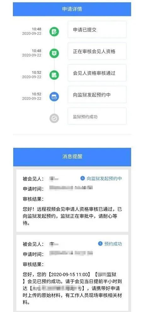 向監獄預約成功后,工作人員會將會見時間、地點及相關要求通過“消息提醒”和手機短信發送給家屬,請注意查收。