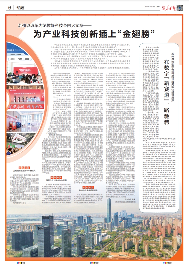 當前,面對打造具有全球影響力的產(chǎn)業(yè)科技創(chuàng)新中心主承載區(qū)這一時代使命,蘇州搶抓金融改革試點機遇,做深做實科技金融,以耐心資本賦能產(chǎn)業(yè)科技創(chuàng)新,以數(shù)字金融提升服務實體經(jīng)濟質(zhì)效,催生出更多原創(chuàng)性、顛覆性科技創(chuàng)新,不斷培育和發(fā)展新質(zhì)生產(chǎn)力。