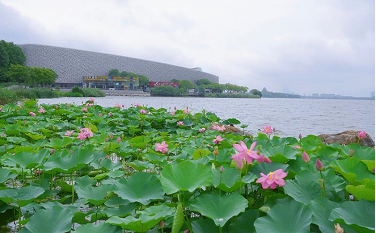 It is a great experience to walk on the Jinji Lake Fitness Trail and watch the rain drops falling and rolling on the water lily leaves. The flowers, pink or white, float on the surface of the lake, rendered quiet by exultant ripples forming one after another near them. It is reminiscent of the “Water Lilies” drawn by Claude Monet.