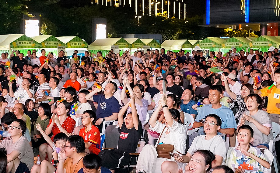 On June 29, many people watched the football match between the Suzhou Team and the Yangzhou Team on the huge screen at Wenxing Square, while enjoying delicious snacks they bought from the surrounding stalls.
