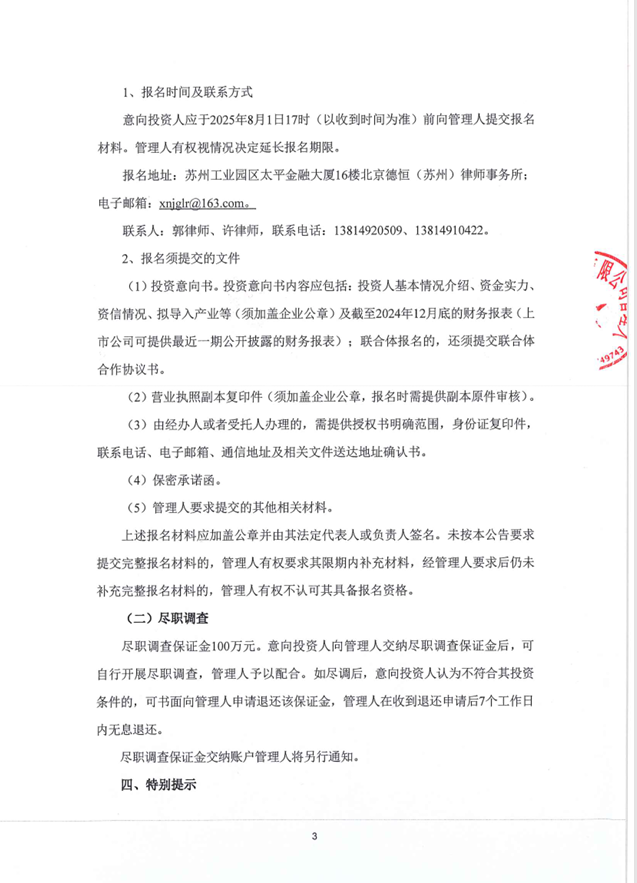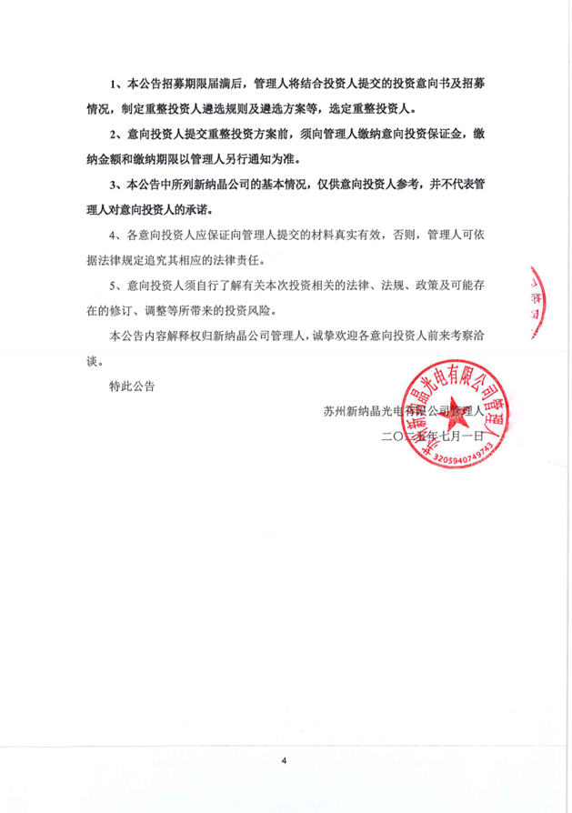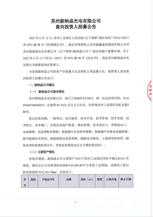 蘇州新納晶光電有限公司關于公開招募意向投資人的公告
