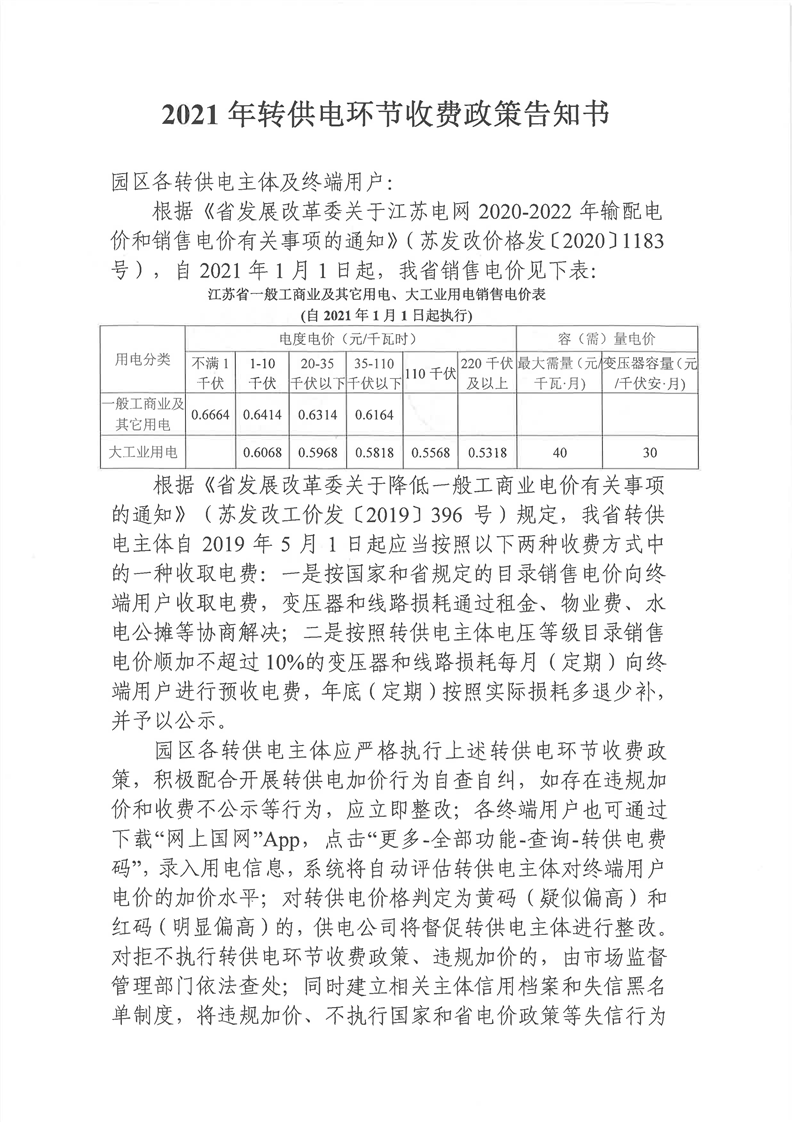 2021年轉(zhuǎn)供電環(huán)節(jié)收費(fèi)政策告知書