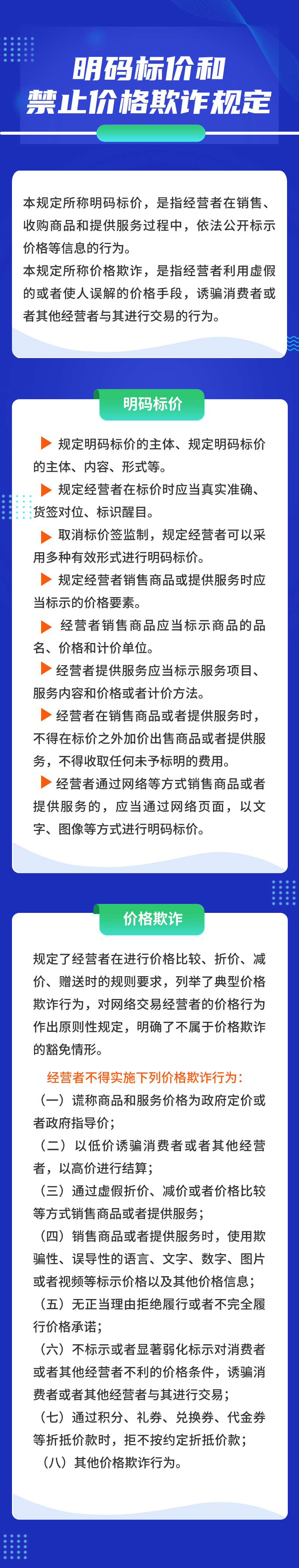 在此,園區(qū)市場監(jiān)督管理局請(qǐng)各經(jīng)營者再次一圖速覽《明碼標(biāo)價(jià)和禁止價(jià)格欺詐規(guī)定》重點(diǎn)內(nèi)容。