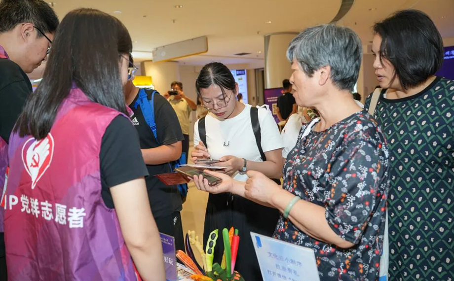 在園區(qū)公文中心服務(wù)點位前,黨員志愿者邀請現(xiàn)場市民共同暢游文化服務(wù)的云端驛站——2.0版本“文化云”小程序。云看展、云賞藝、云悅讀、云賽場等一站式“可看、可約、可互動”的線上文化大餐讓人眼前一亮,帶來了優(yōu)質(zhì)的文化體驗。