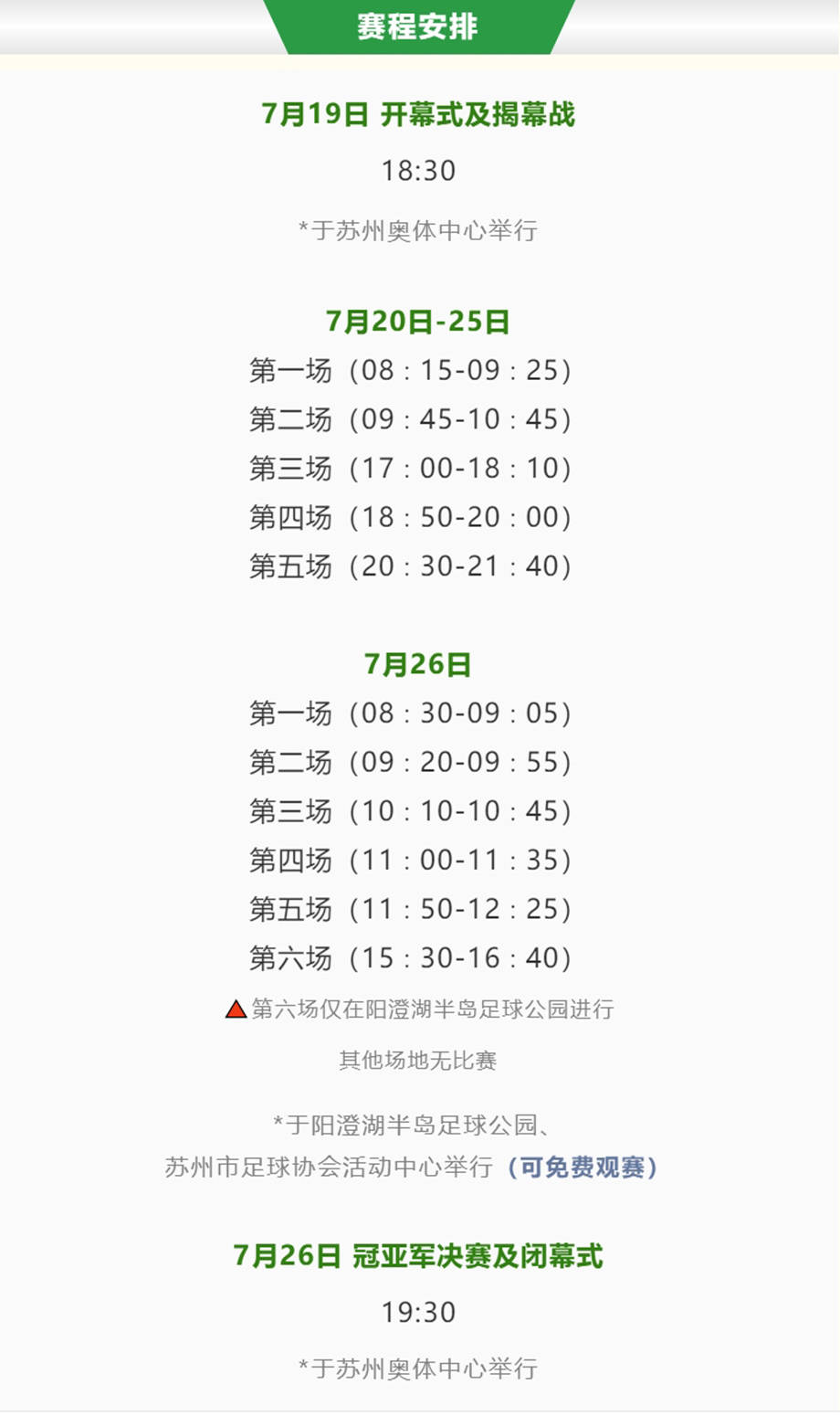 本次比賽將在7月19日——7月26期間舉行,其中五分之四以上場次的賽事(約300多場)將在陽澄湖半島足球公園、蘇州市足球協會活動中心進行,屆時歡迎各位足球迷們前來免費觀賽。